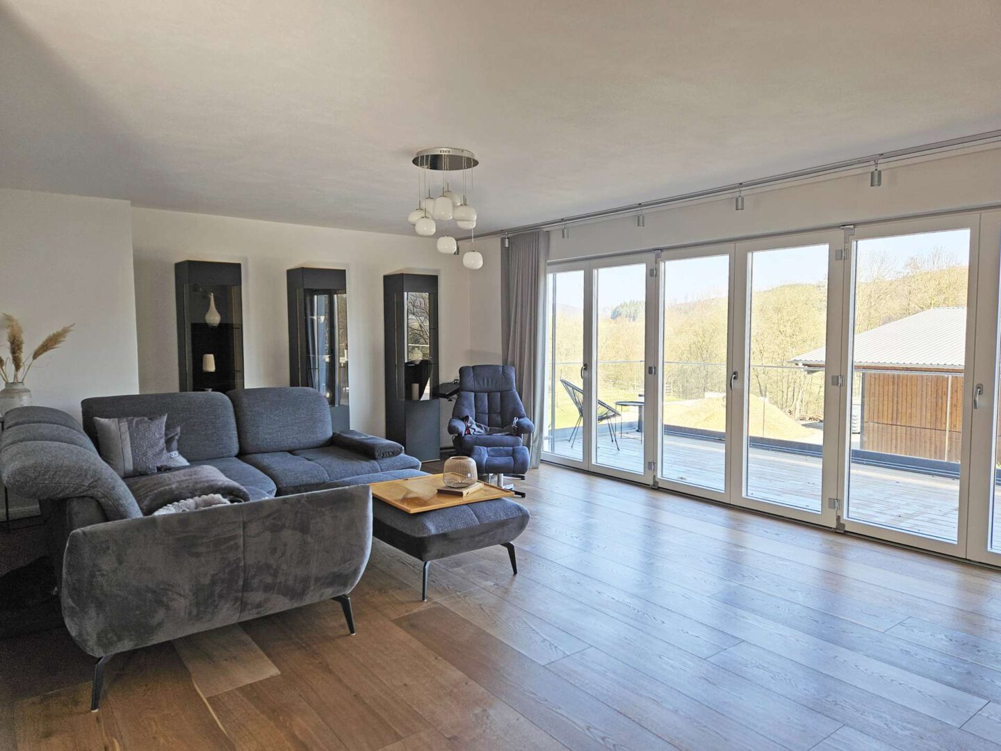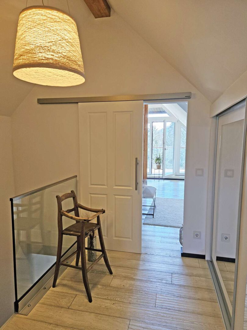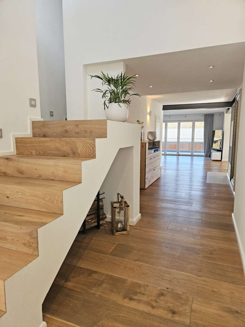Im Erdgeschoss spielt sich das Leben ab: ein großzügiger Wohn- und Essbereich mit Kamin, offener Küche und großen Fensterflächen, die den Blick ins Grüne freigeben. Von hier aus geht es direkt auf den weitläufigen Balkon der Platz für lange Abende oder Frühstück in der Sonne bietet. Das Erdgeschoss wird über eine angenehme Fußbodenheizung beheizt – unsichtbarer Komfort, der den offenen Wohnstil perfekt ergänzt.