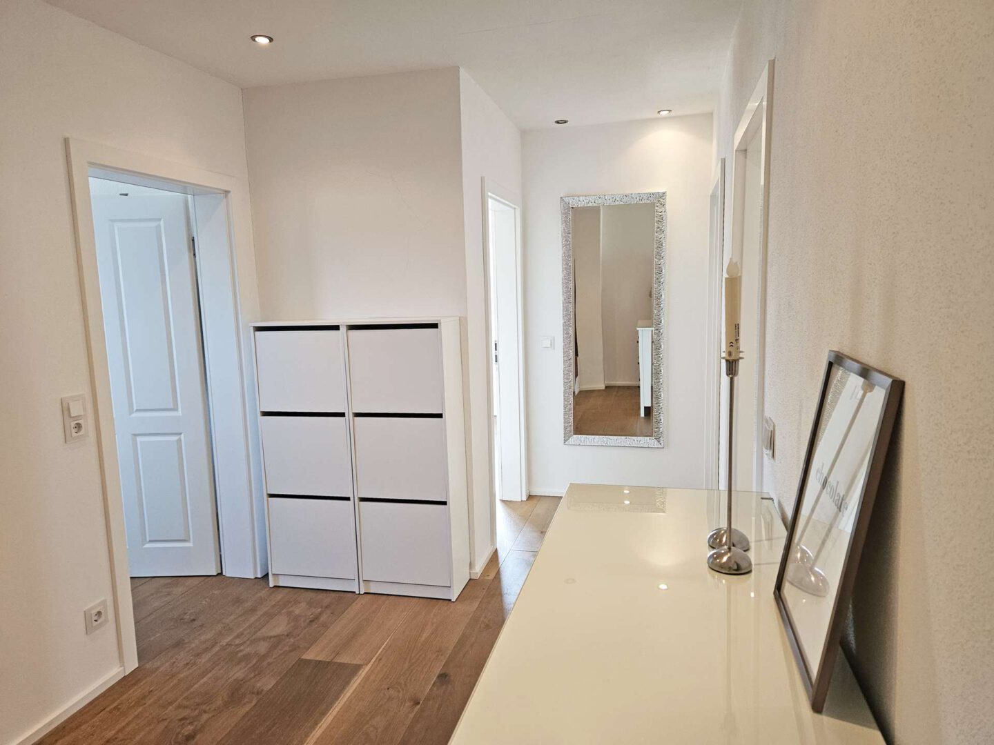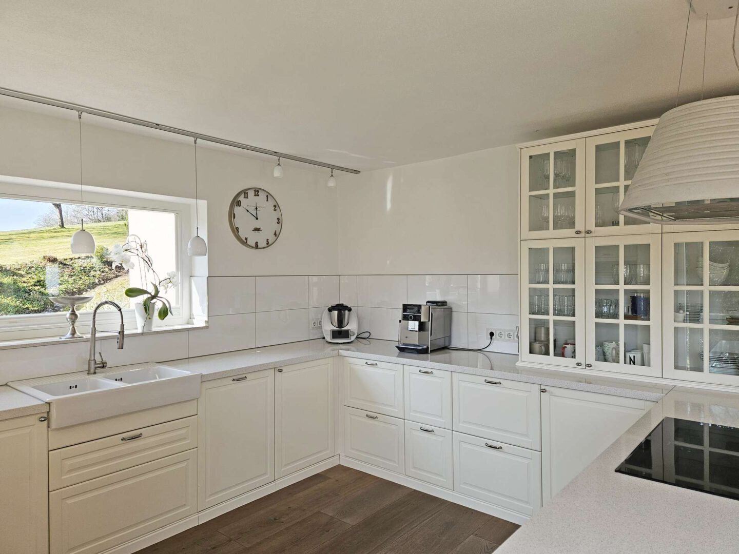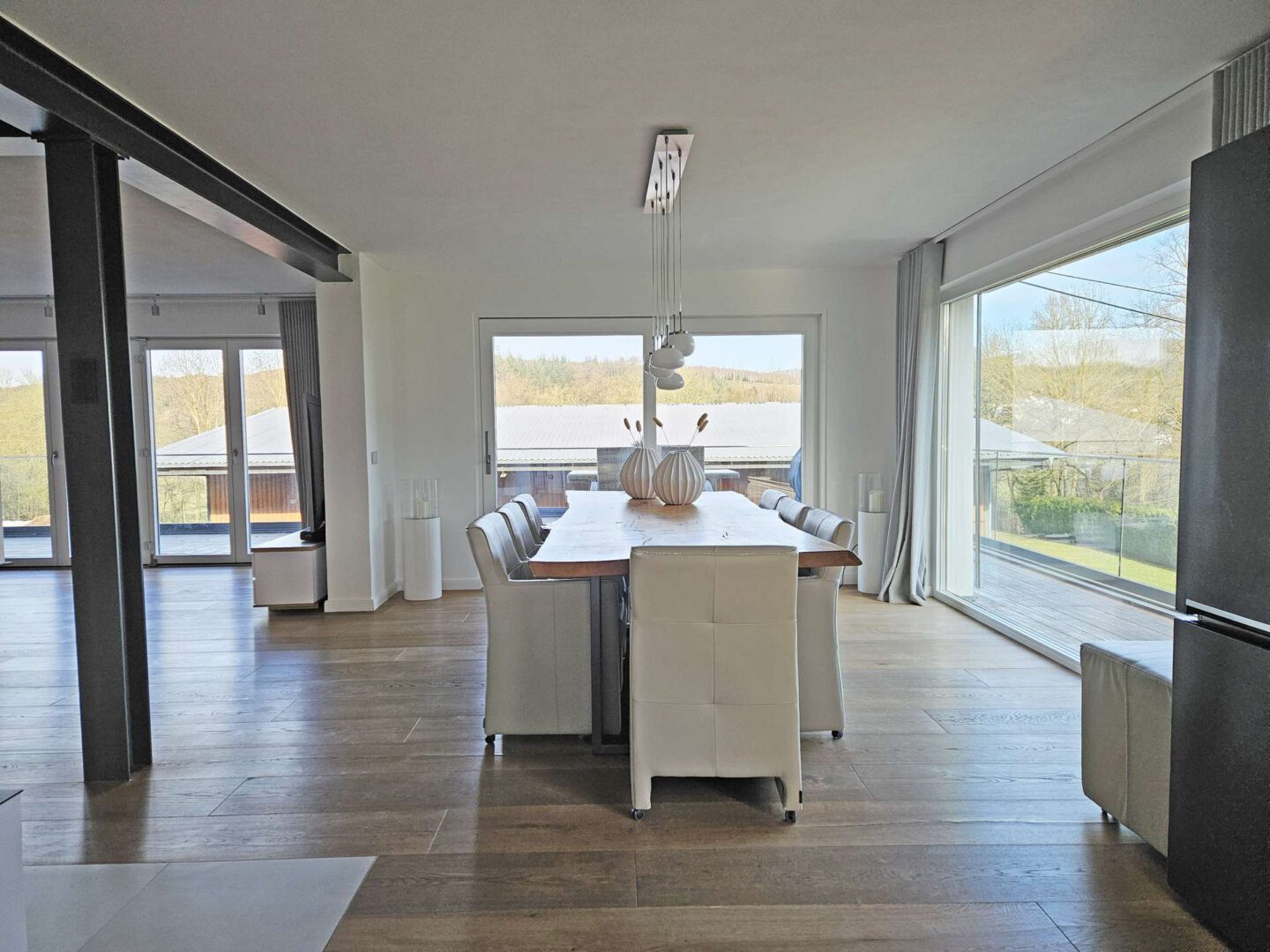 Im Erdgeschoss spielt sich das Leben ab: ein großzügiger Wohn- und Essbereich mit Kamin, offener Küche und großen Fensterflächen, die den Blick ins Grüne freigeben. Von hier aus geht es direkt auf den weitläufigen Balkon der Platz für lange Abende oder Frühstück in der Sonne bietet. Das Erdgeschoss wird über eine angenehme Fußbodenheizung beheizt – unsichtbarer Komfort, der den offenen Wohnstil perfekt ergänzt.