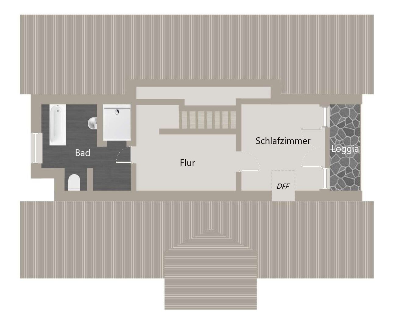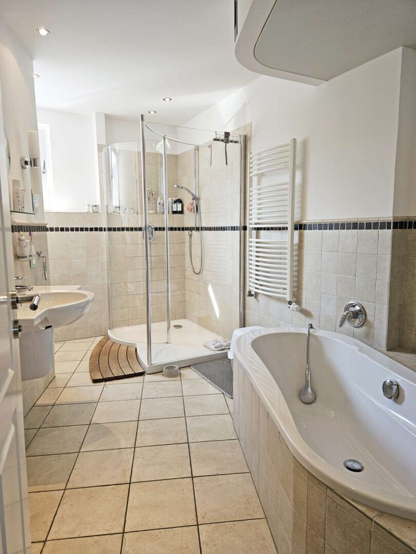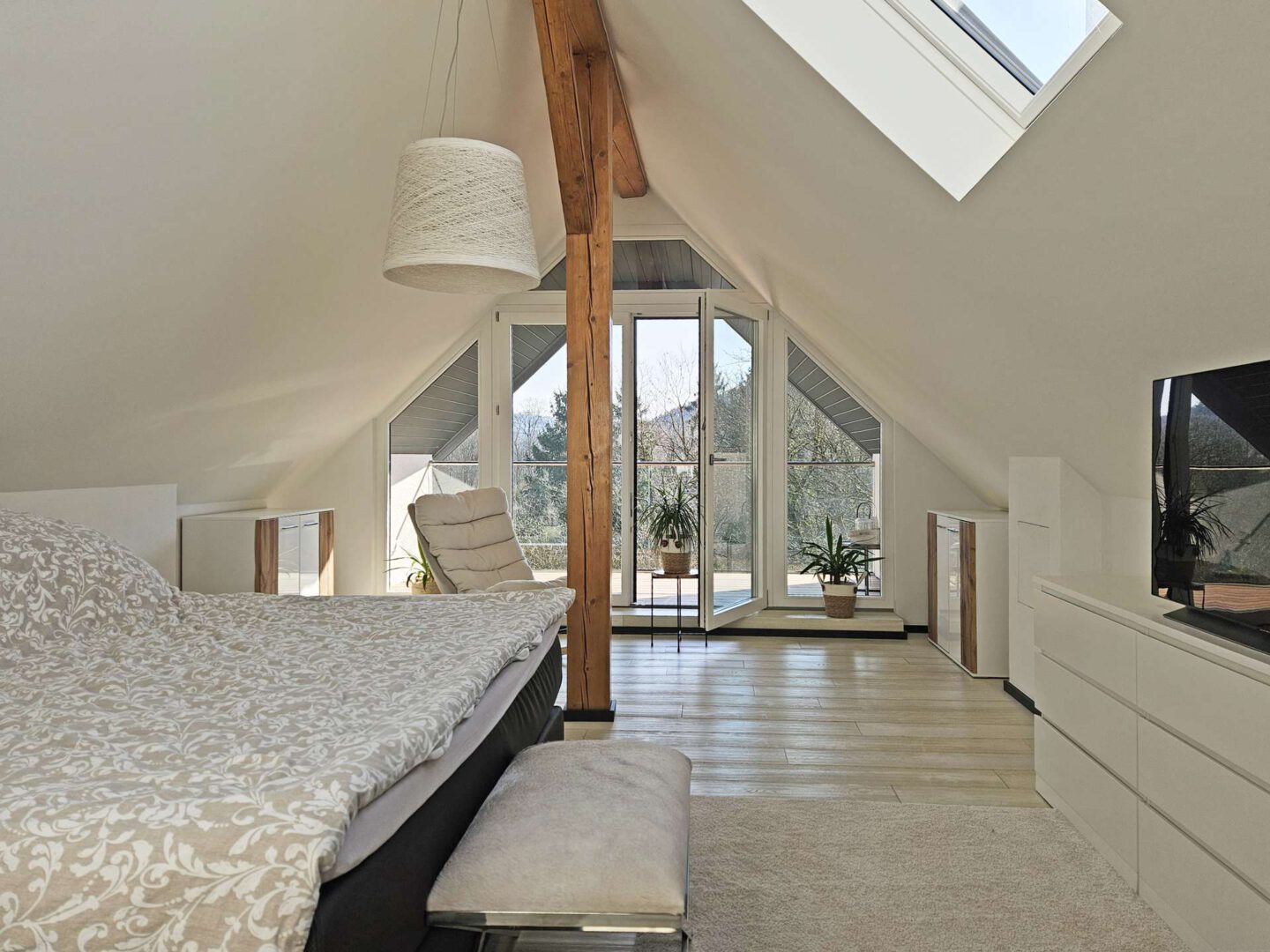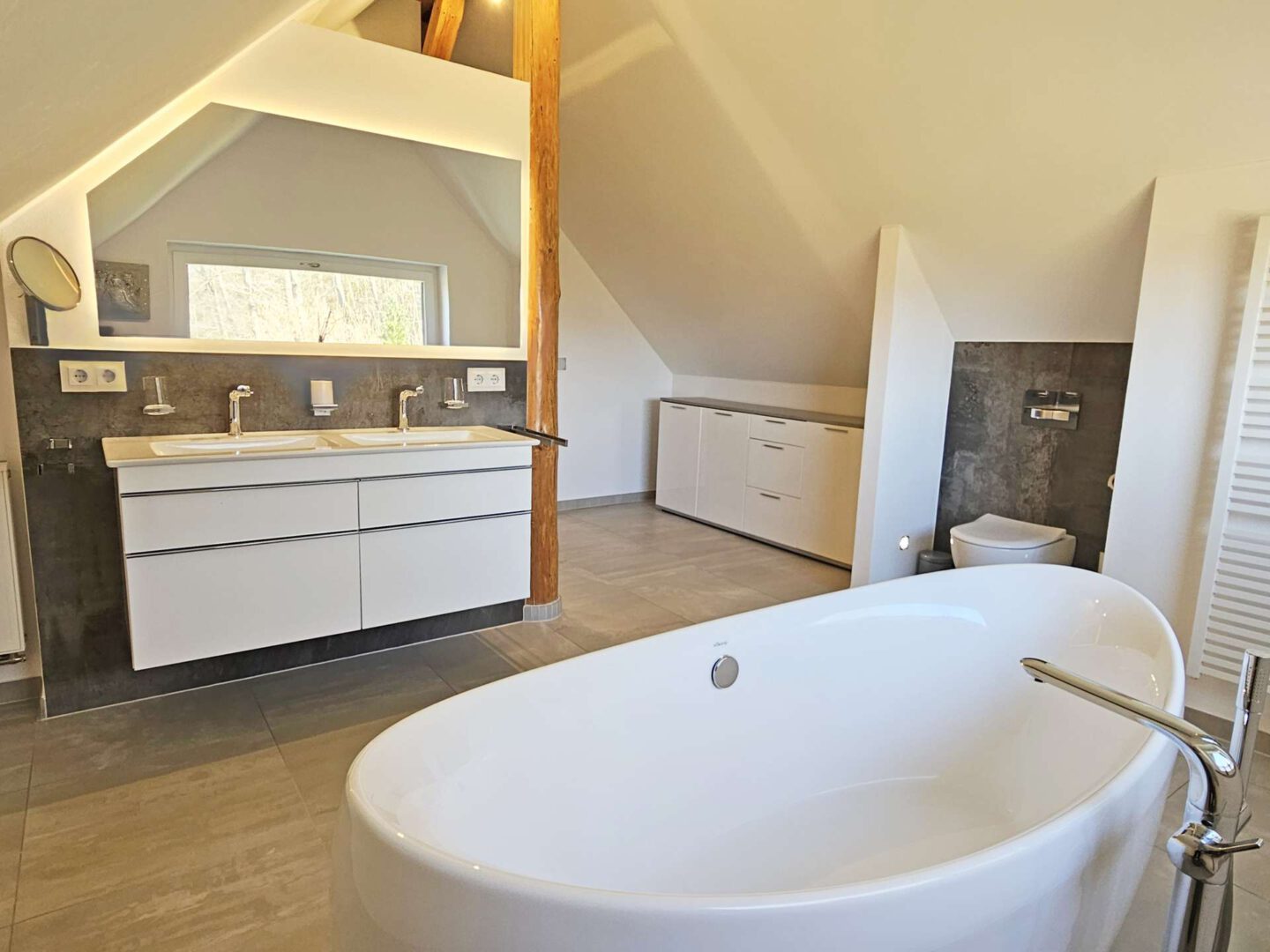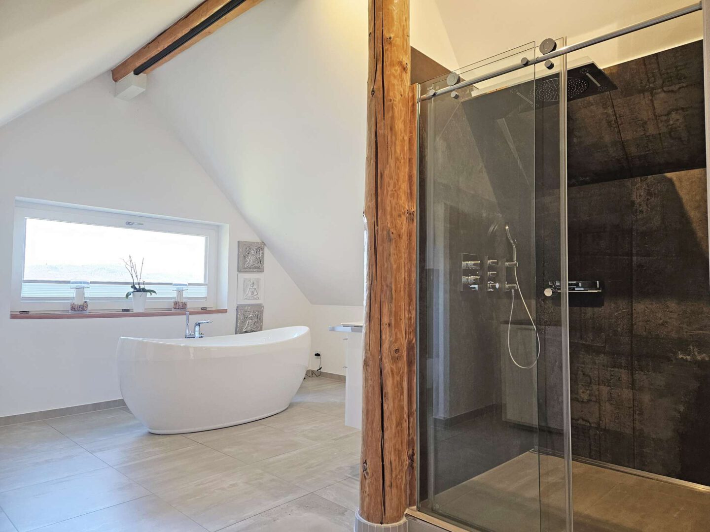 Ganz oben, im ausgebauten Spitzboden, wird es richtig besonders. Ein weiteres Schlafzimmer, eine eigene Loggia und ein hochwertiges Bad mit freistehender Wanne und bodengleicher Dusche erzeugen einen Rückzugsort der fast schon Hotel-Charakter hat.