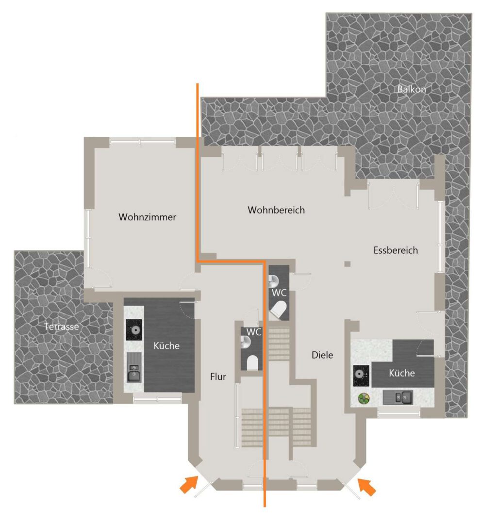 Die zweite Wohneinheit ist funktional aufgeteilt und bietet rund 129 m² Wohnfläche über zwei Etagen. Hier ist alles vorhanden, um direkt anzusetzen: eine tolle Raumaufteilung, helle Zimmer und eine solide Basis. Die Einheit ist renovierungsbedürftig, bietet jedoch genau dadurch die Möglichkeit, sie nach eigenen Vorstellungen zu gestalten.
