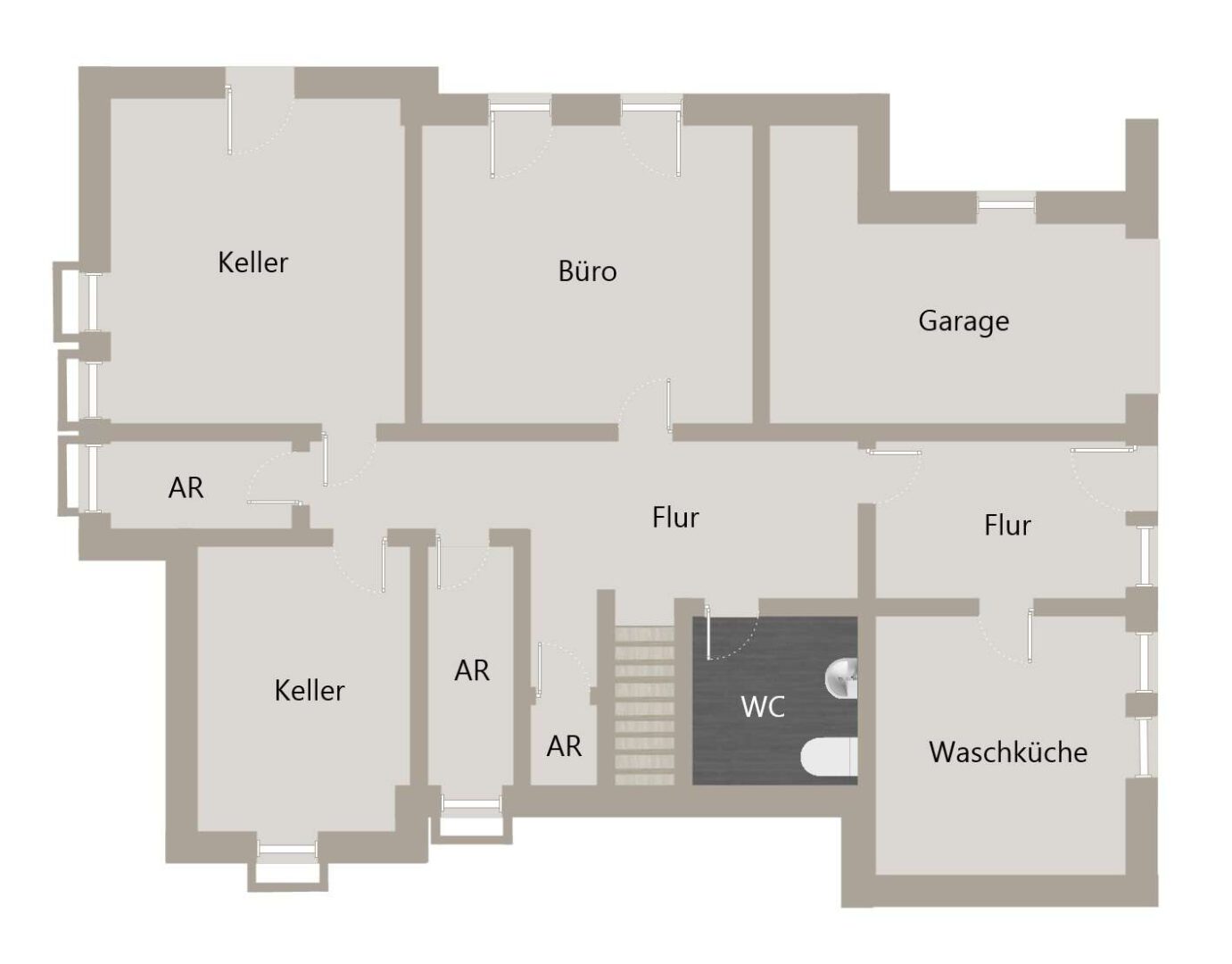 Das Haus ist voll unterkellert und bietet mehrere Kellerräume, ein Büro mit Tageslicht und Terrassenzugang, ein WC sowie eine Waschküche. Ein separater Zugang zum Untergeschoss mit eigener Haustür ermöglicht eine unabhängige Nutzung.
