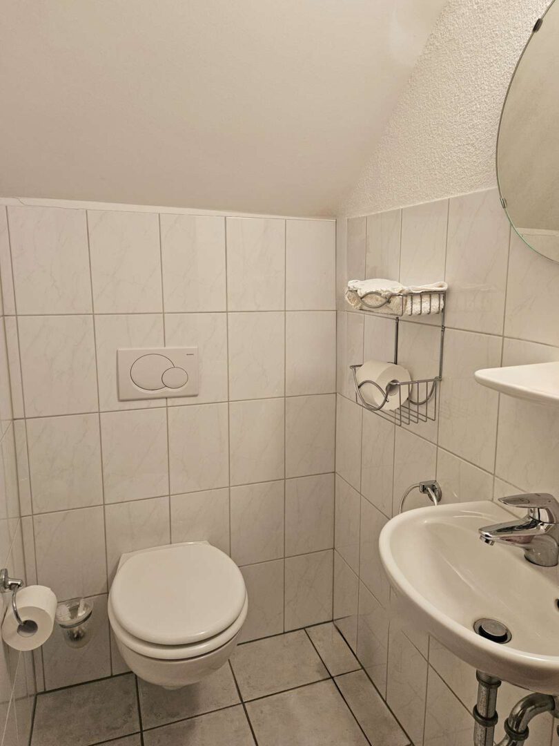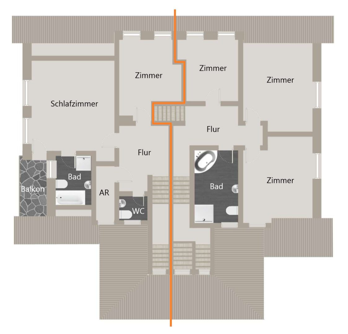Im Dachgeschoss warten drei Zimmer und ein modernes Bad mit Tageslicht, Badewanne und bodengleicher Dusche auf Sie.
