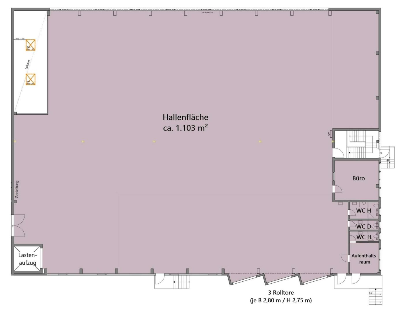 Die Halle selbst umfasst 1.100 m² und verfügt zusätzlich über ein rund 22 m² großes, helles Büro - perfekt für administrative Aufgaben. Ein separater Aufenthaltsraum sowie getrennte Herren- und Damen-WCs sorgen für das Wohlbefinden Ihrer Mitarbeiter.