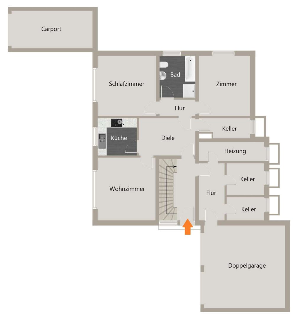Der Zugang erfolgt über das Untergeschoss, in dem sich eine etwa 73 m² große Wohnung befindet. Sie bietet ein gemütliches Wohnzimmer, zwei Schlafzimmer, eine Küche sowie ein helles Tageslichtbad mit Wanne und Dusche. Auf dieser Ebene liegen außerdem mehrere Kellerräume, der Heizungsraum und der direkte Zugang zur angrenzenden Doppelgarage.