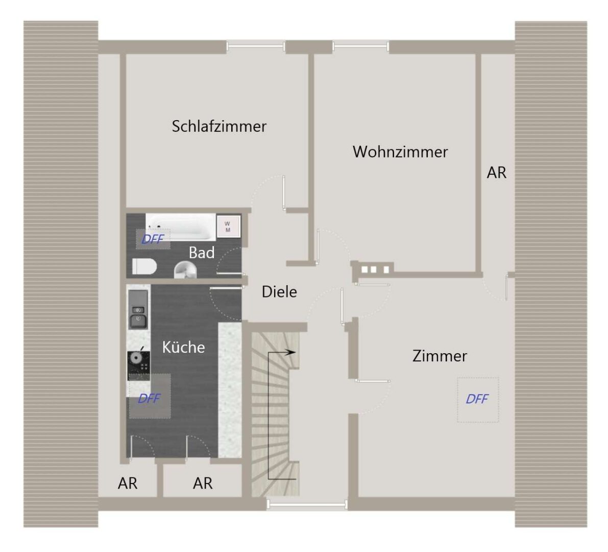 Zusätzlichen Platz bietet das ausgebaute Dachgeschoss, welches eine weitere Wohneinheit mit rund 80 m² Wohnfläche umfasst. Hier entstanden drei Zimmer, eine Küche und ein Tageslichtbad. Da für den Ausbau seinerzeit keine Baugenehmigung eingeholt wurde, ist dieser Bereich nicht in die offizielle Wohnflächenberechnung eingeflossen, eröffnet jedoch zahlreiche Nutzungsmöglichkeiten – sei es als zusätzlicher Wohnraum, als Hobbyetage oder als großzügiger Homeoffice-Bereich.