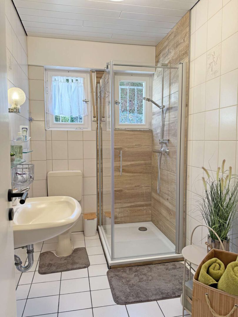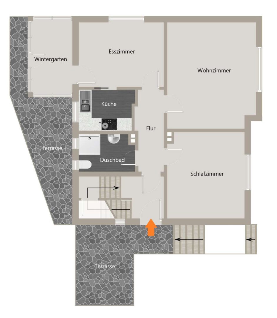Die Erdgeschosswohnung (ca. 66 m²) bietet ein einladendes Wohnzimmer, ein Schlafzimmer sowie ein Esszimmer mit einem angrenzenden, offenen Küchenbereich und direktem Zugang zum Wintergarten und zur Terrasse. Ein modernes Tageslicht-Duschbad mit bodengleicher Dusche rundet diese Einheit stilvoll ab.