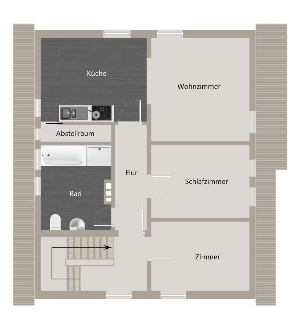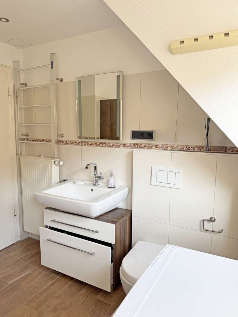 Im Dachgeschoss (ca. 57 m²) erwartet Sie eine weitere Wohnung mit einem Schlafzimmer, einem hochwertigen Tageslichtbad mit Wanne und bodengleicher Dusche sowie einer Küche mit kleinem Abstellraum und angrenzendem, offenem Wohnbereich. Ein zusätzliches Schlafzimmer außerhalb der Wohneinheit bietet weiteren Raum für individuelle Nutzungsmöglichkeiten.