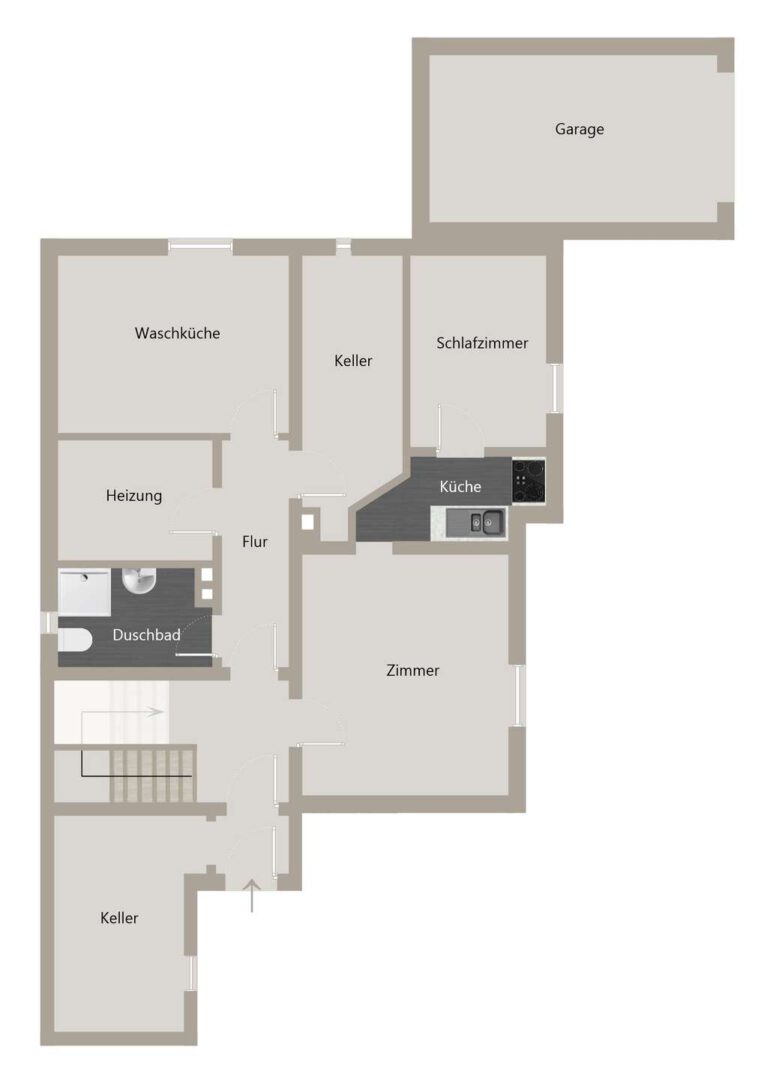 Das Untergeschoss (Wohnfläche ca. 17 m² zzgl. Kochbereich & Schlafzimmer) überzeugt mit zwei Zimmern, einem kleinen Kochbereich, einem Duschbad mit Fenster sowie einer Waschküche, einem Heizungsraum und zwei Kellerräumen.